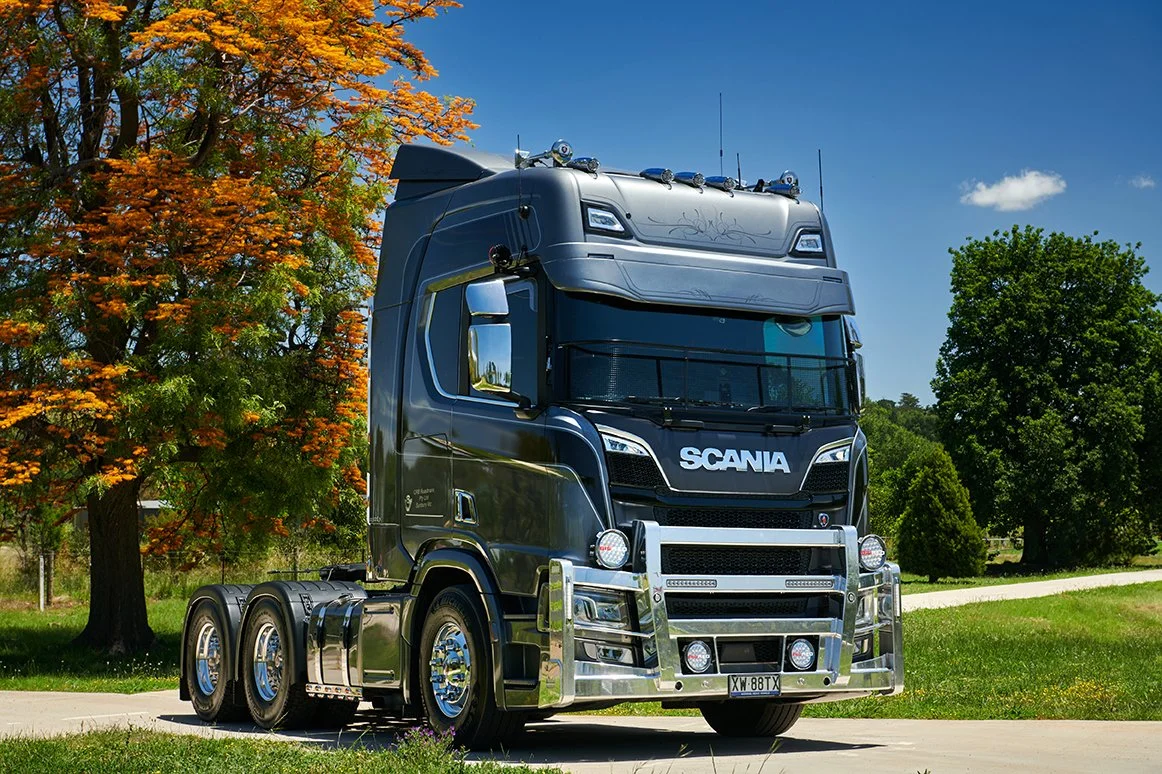 Customised, accessorised, idolised, Chris Bonnitcha’s new Scania R 620 V8 turns heads each time he turns a wheel, thanks to a stunning Mountain Grey paint job, scroll work and lashings of stainless steel.