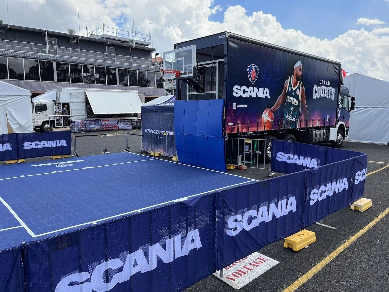 Across the street from the show hall at ‘The Depot’, Scania’s Dunk Truck, a P-series rigid fitted out with a basketball ring and accompanying 10 m2 Dream Courts’ flooring enticed aspirant technicians to shoot some hoops while learning about career opportunities with Scania.
